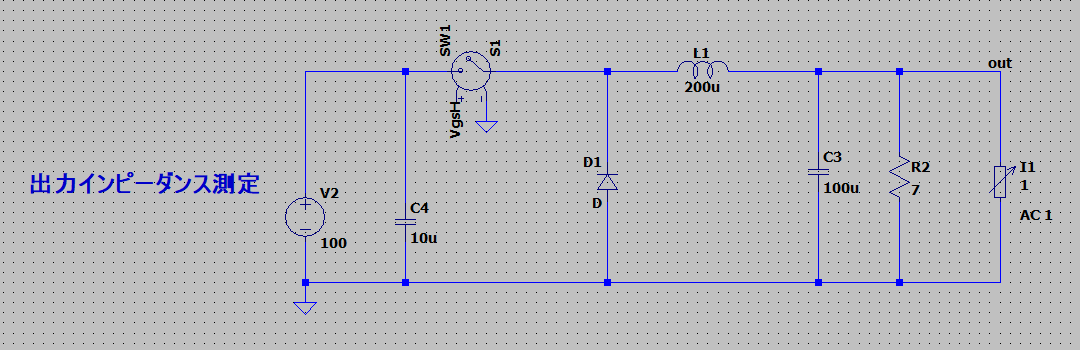 LTspiceでの出力インピーダンス測定用シミュレーションモデルを以下に示す。入力電源にAC解析用信号を入れ、入力電流を変化させる。そのときのΔvinとΔiinを測定し、入力インピーダンス:Zinを求める。今回、降圧コンバータは固定デューティで動作させた場合で測定する。